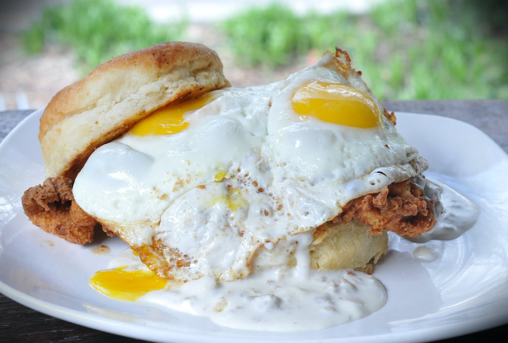 For a real indulgence, try the Buffalo Comfy— a huge plate of fried chicken smothered in buffalo sauce and sausage gravy atop a comfy biscuit. You’ll probably need a nap after.