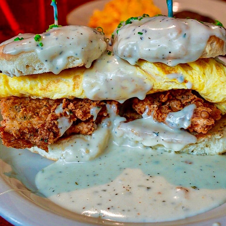 The restaurant itself is housed in an old home and they are known for their simple, basic Southern breakfast staples like biscuits, grits, and eggs. They make everything with heart, and the above-shown fried chicken and waffles as well as the Comfy Chicken Biscuit are the most popular dishes with locals.
