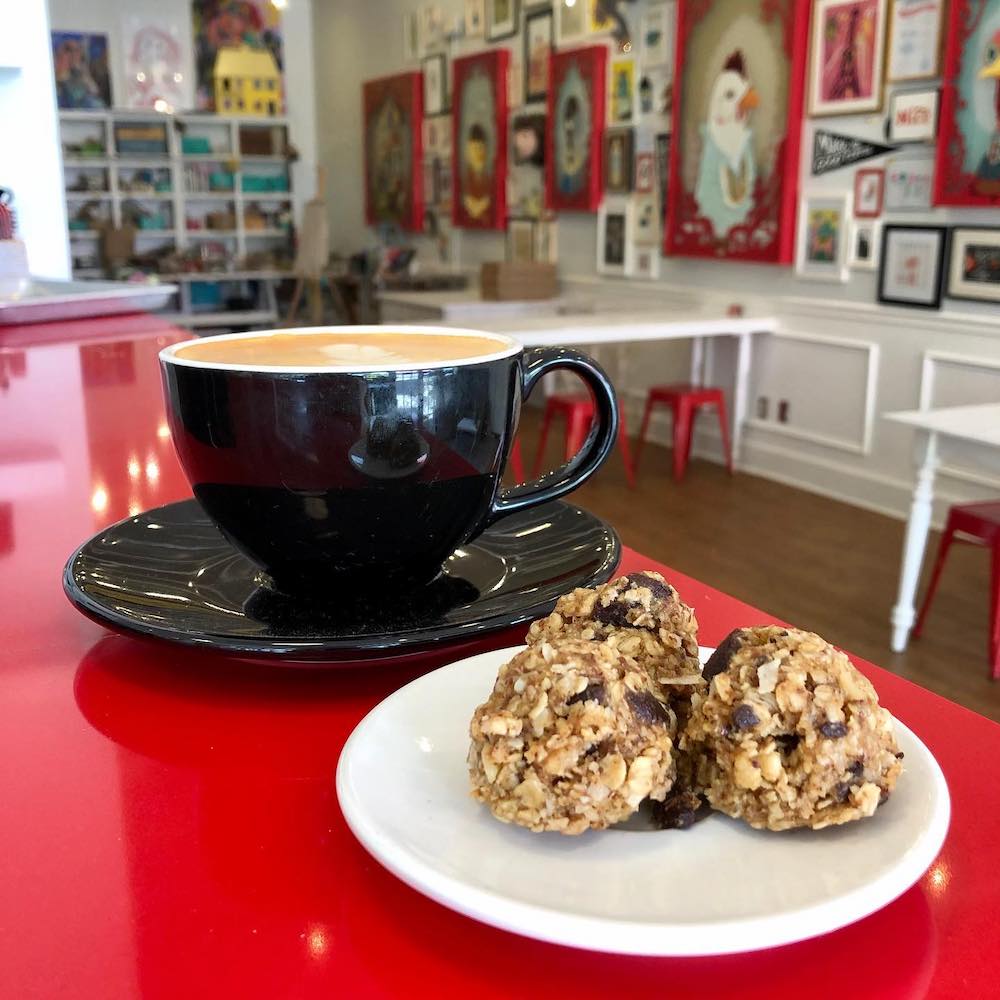 The menu here also features satisfying cafe staples like Cubano paninis, grilled cheese, biscuit sandwiches, and vegan cinnamon rolls. Even the homemade gluten-free energy bites (above shown) are artisanal and delicious.