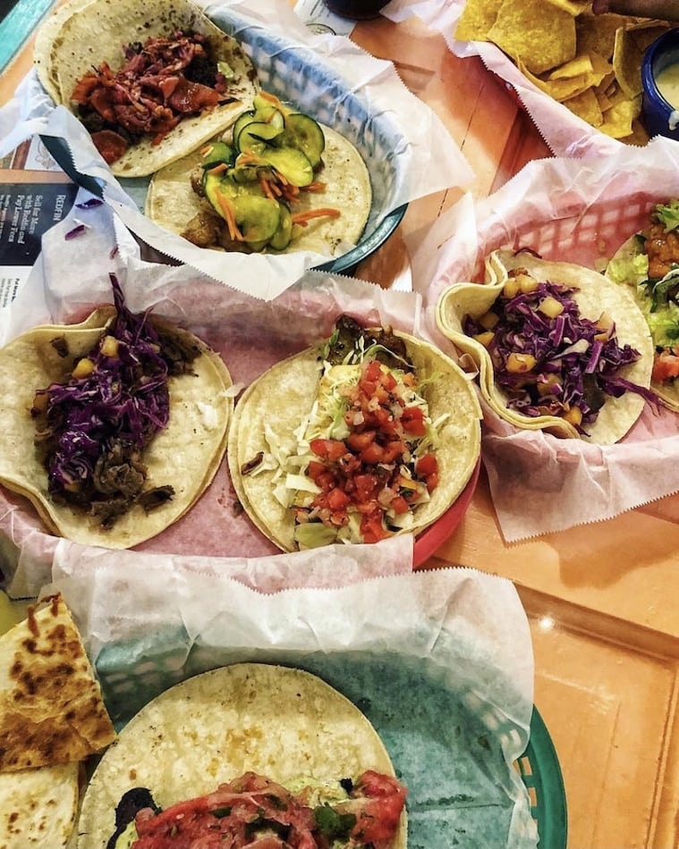 This casual local taco shop has multiple locations around Asheville, but we like the quirky hipster vibe at the River Arts District location on Riverside Drive the best.