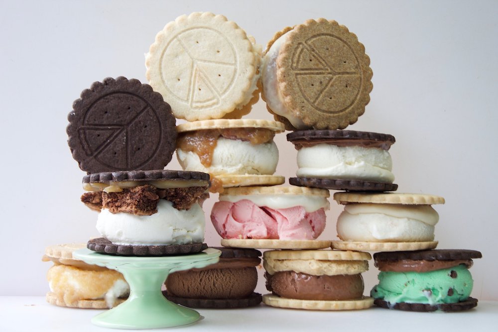 Flavors include Peanut Butter Brownie (vanilla ice cream, brownies, and peanut butter chiffon sandwiched between two shortbread cookies) and Salted Caramel Apple (vanilla ice cream, salted caramel, and apple pie filling between two cinnamon cookies).