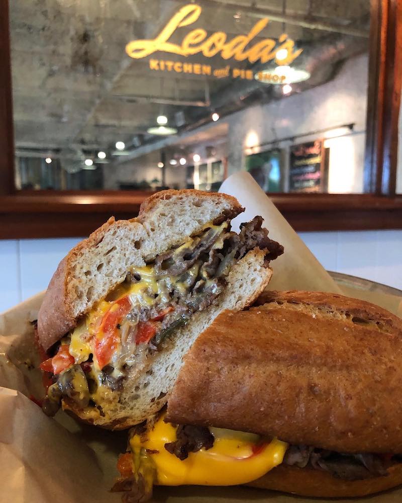 Overall, Leoda’s Kitchen & Pie Shop is known for its excellent, filling burgers and sandwiches, like the Hawaiian-style cheesesteak featuring house-roasted Maui beef, kula onions, bell peppers and American cheese on a hapa hoagie. (See image above.)