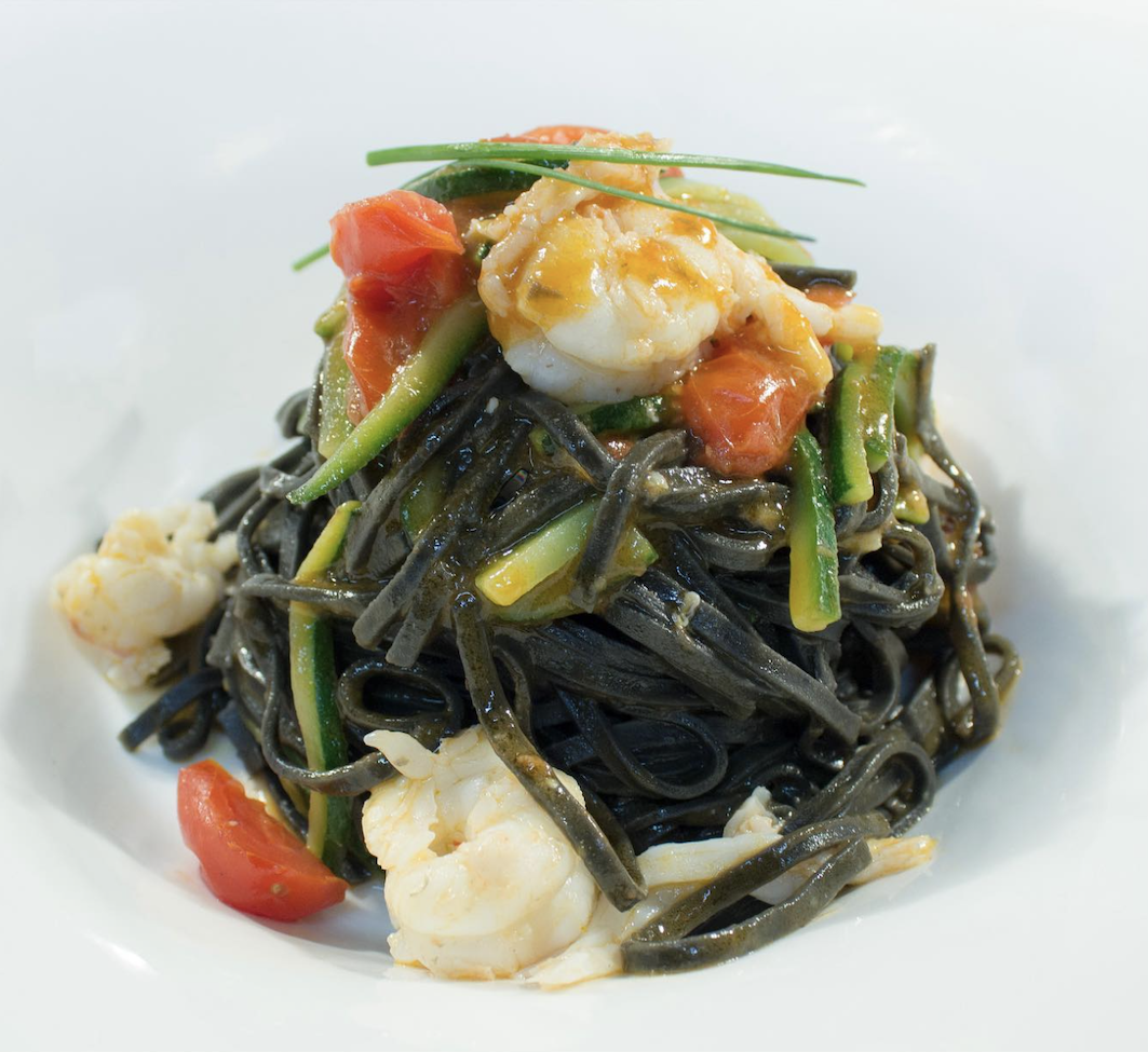 I also love the light lunch pastas, like the black tagliolini pasta with scampi, zucchini, and tomatoes; or the soft tendrils of strozzapreti pasta with prawns, artichokes, and marjoram.