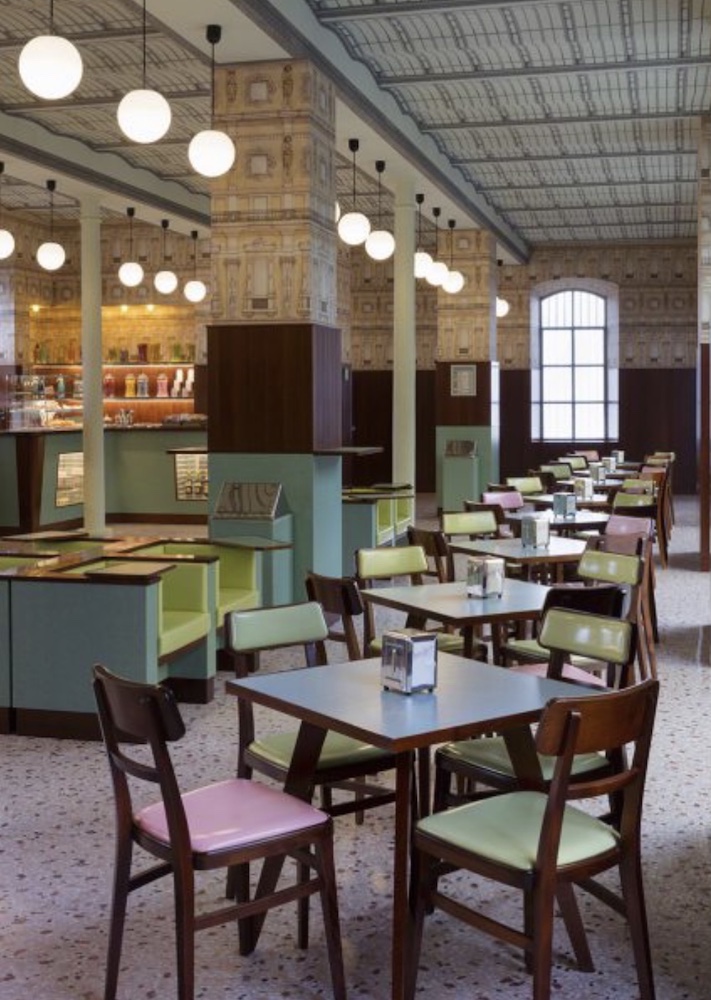 The vibe at this cafe-inside-an-art-gallery is Anderson’s take on an Old Milanese cafe, circa the 1950s and 1960s. Incorporating references to Italian Neorealism– specifically Miracle in Milan (1951) by Vittorio De Sica and Rocco and his brothers (1960) by Luchino Visconti, this eatery feels like an inspired, living work of art.