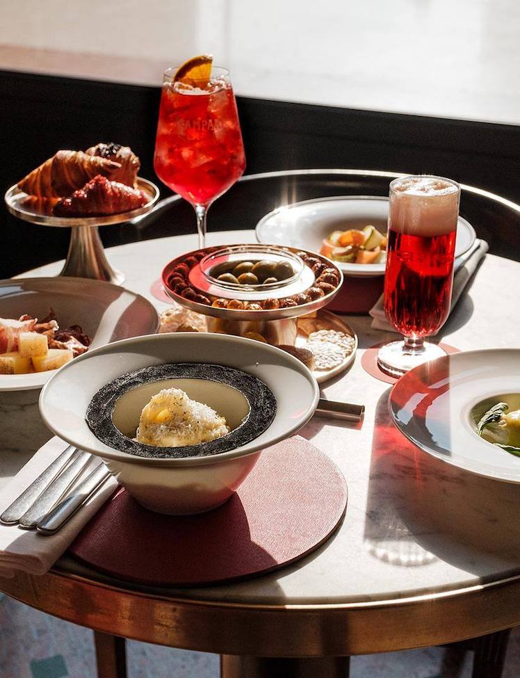 The bread is filled with various toppings that purposefully pair well with Campari-based cocktails, like savory beef and cheese, or little gems salad with sundried tomatoes and mozzarella. Try them out from lunch to dinner.