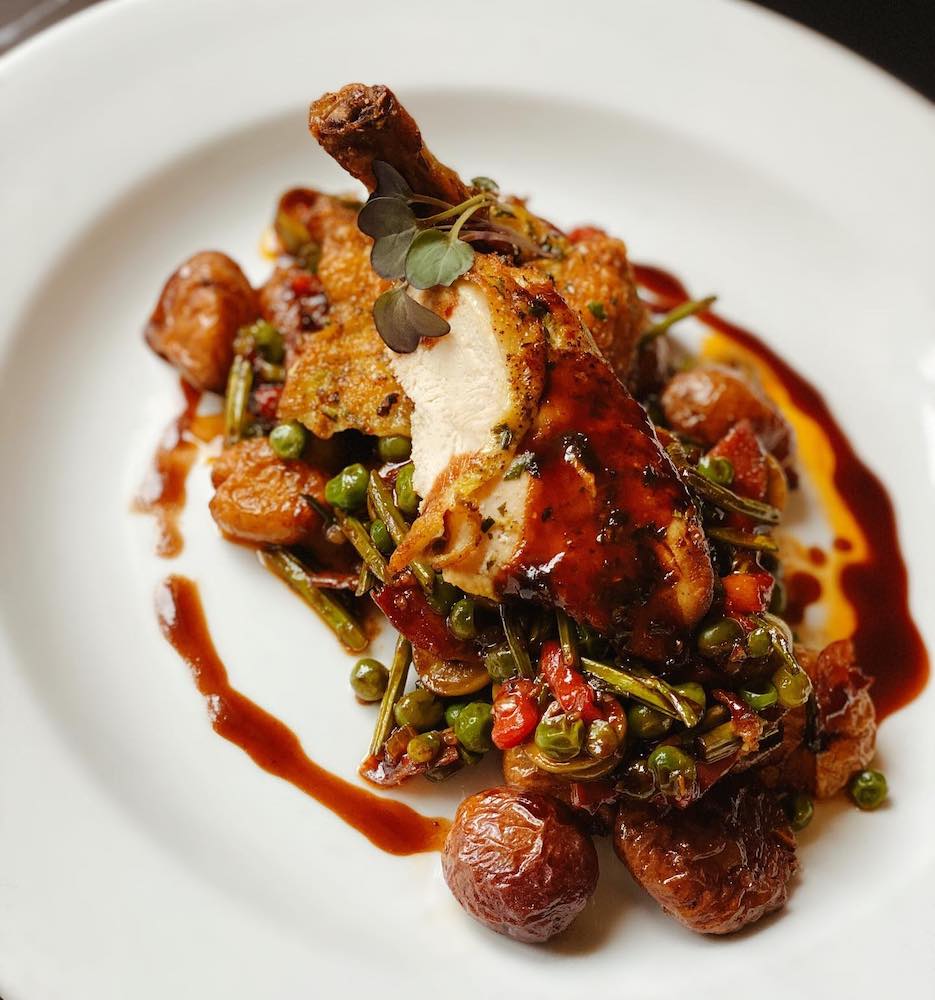 For example, Fried Quail + Buttermilk Thyme Waffles with rye whiskey molasses and pickled corn relish. However, they’ve also done classic Organic Free Range Buttermilk Fried Chicken, served with hubbard squash waffles, pralined bacon, and bourbon maple syrup. Either way, this dish is always an adventure. So good!