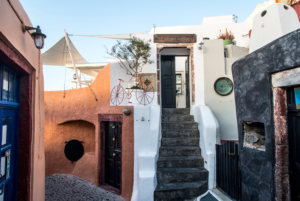 Winding one’s way through serpentine stairwells in search of a good restaurant is a Santorini rite of passage. This restaurant captures that spirit perfectly. The entrance is a bit confusing, but everyone finds it eventually. 🙂