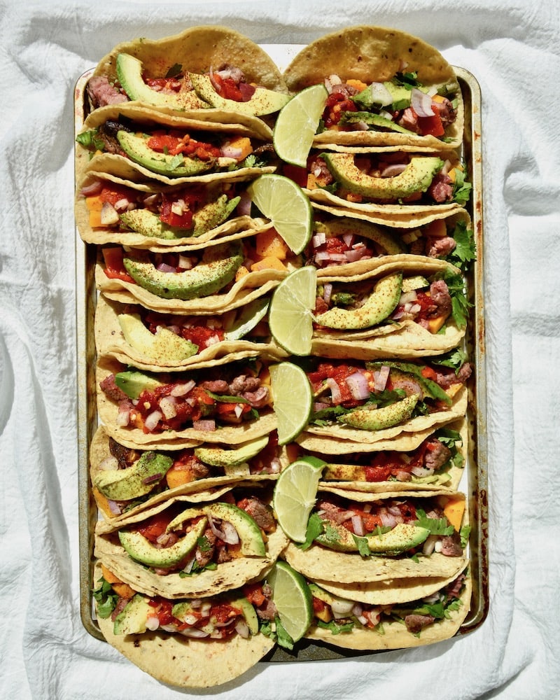The below steak taco recipe is quick to prepare and beautiful to look at. Serve these tacos on a cookie tray with a few generous lime wedges, which brighten the whole dish and make the recipe seem more sophisticated than it is. (The pictures in this article don’t lie!👇)