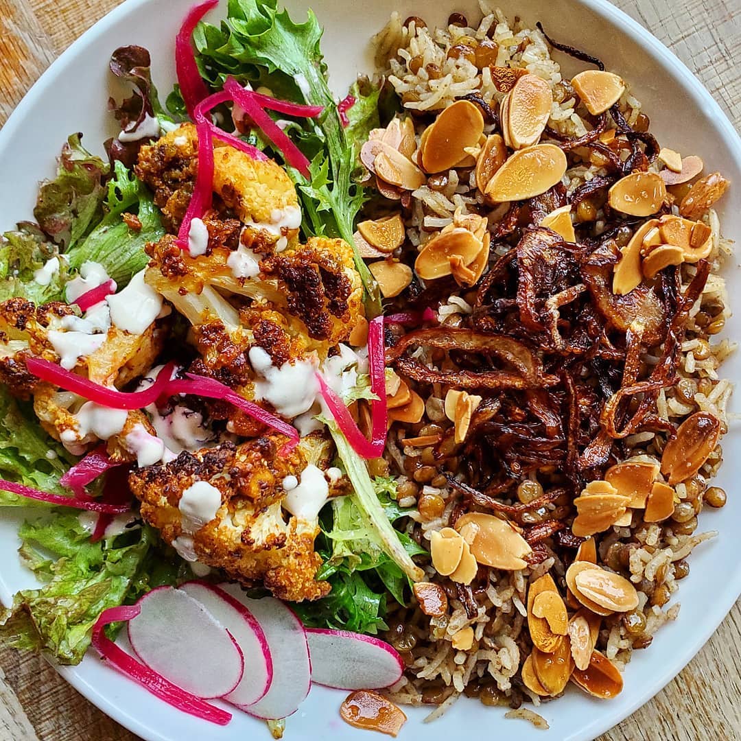 The salads here are also excellent, with flavorfully seasoned dishes like the mujudarra shown above. Sandwiches– like the popular Avocado Sandwich made with shiitake bacon, red pepper, greens, and tahini– can also be made gluten-free.