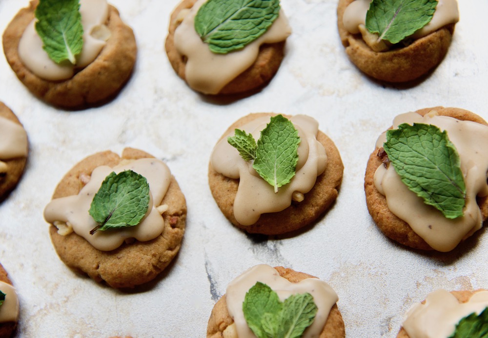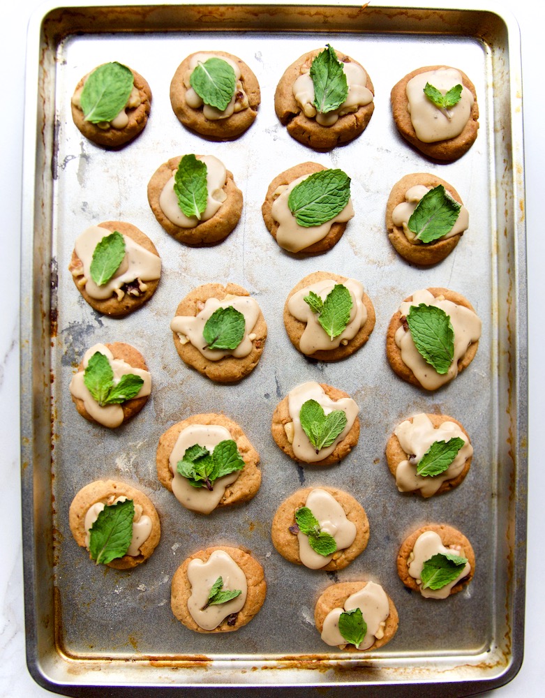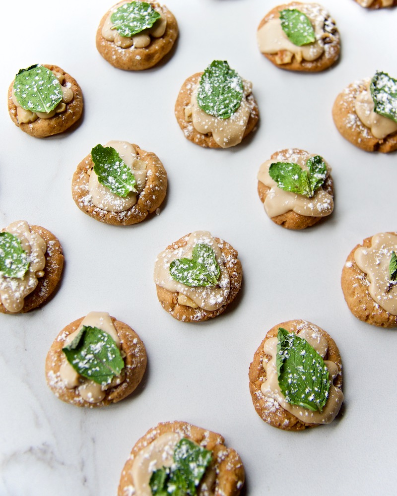 Topped with a sprig of mint, each cookie can be eaten in one bite, sort of like a canapĂ©. This way, you get all the flavors at once– and you can justify eating three of them. 🙂