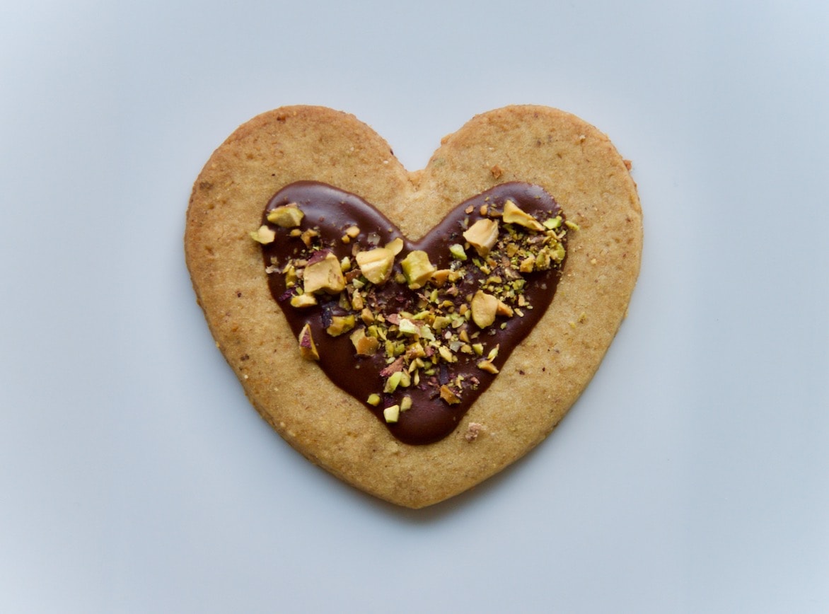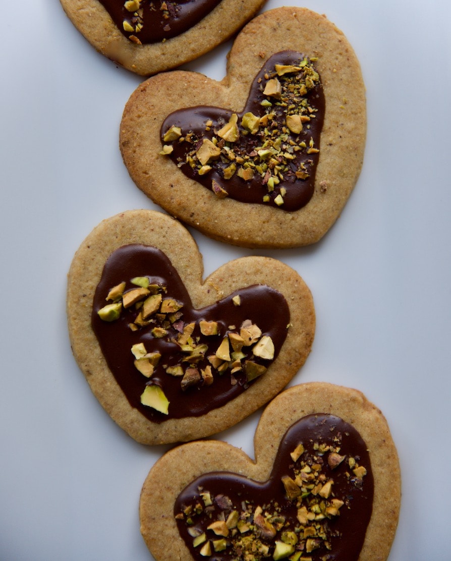 - Melt chocolate chips in a saucepan or double boiler and draw a heart shape in the middle of each cookie with the back of a spoon. Sprinkle with chopped pistachios. Enjoy!