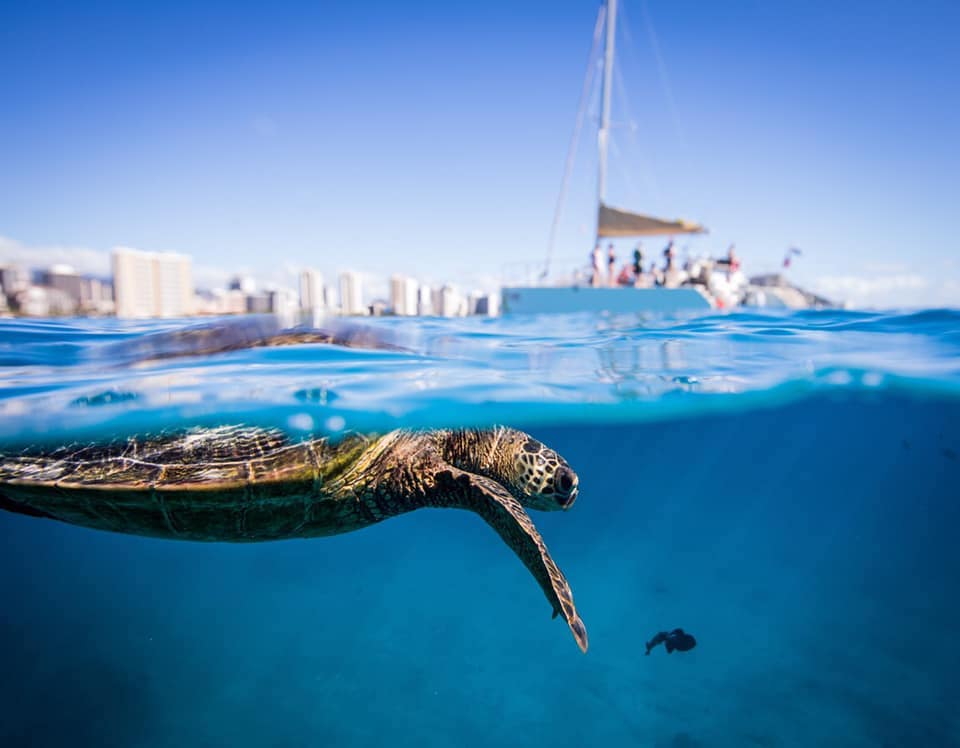 Snorkeling with turtles is a favorite O’ahu activity among visitors and locals. For me, what makes it exceptionally cool is the fact that O’ahu is one of the few islands where you can take a catamaran out to swim with giant sea turtles while still being able to see the beautiful, urban city skyline in the distance. It’s wild.