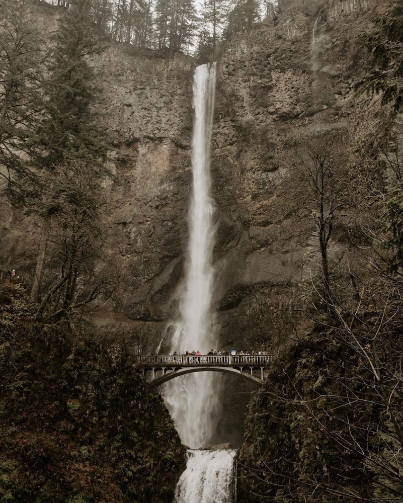 One of the most famous outdoor landmarks in the greater Portland area is a waterfall viewing spot from a bridge at Multnomah Falls.