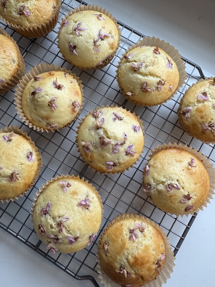 This recipe makes 1 dozen cute, flower-topped redbud muffins.