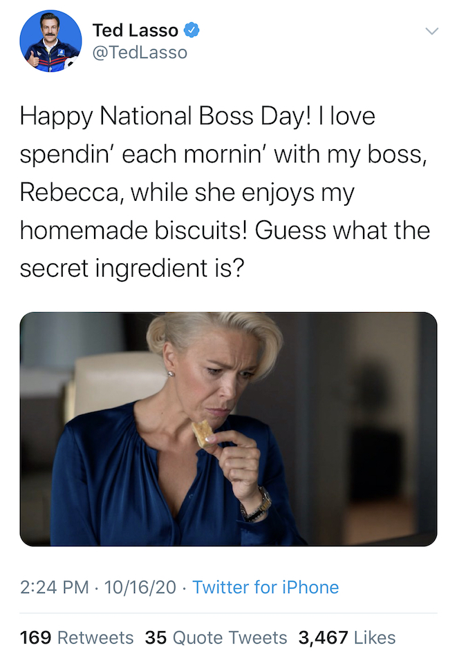 Going forward, whenever they have a meeting, Ted brings her these cookies. He calls it “Biscuits with the Boss.”  Soon, this special little ritual becomes a symbol of the growing friendship between the two. Viewers, of course, were won over by the gesture, as well.