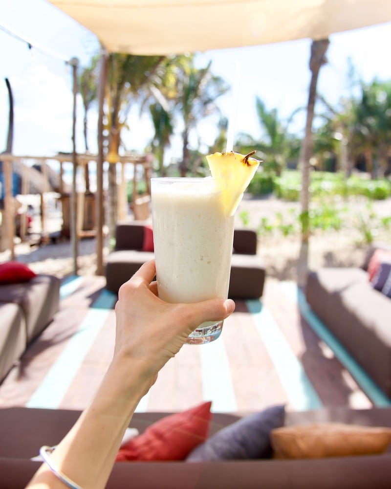 Alma Tulum Hotel (detailed below in our hotel section) has beautiful, rustic wooden swings on the beach next to their shaded cabanas. It’s an ideal place to sip a fresh piña colada (virgin or regular!) made with locally sourced pineapple!