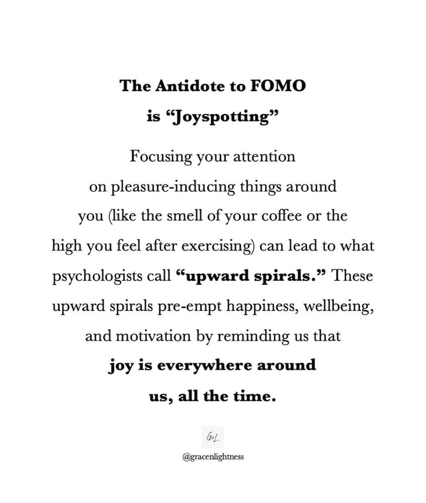 Because joyspotting is an easy-to-apply mind hack, people use this as a technique to get over FOMO (aka fear of missing out), as well.
