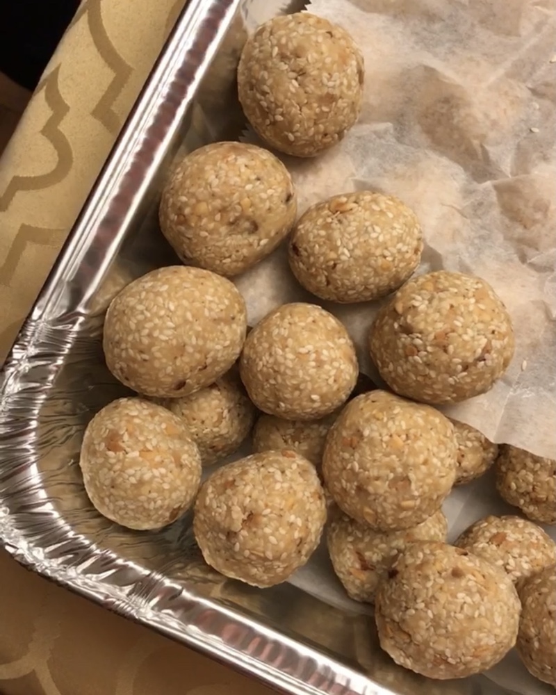 At my husband and my wedding Lohri, we gave a special ladoo made with khoya (milk powder) and sesame seeds, which made the favor a little fancier. These are called til bhuga ladoo, and that’s a picture of them, below.