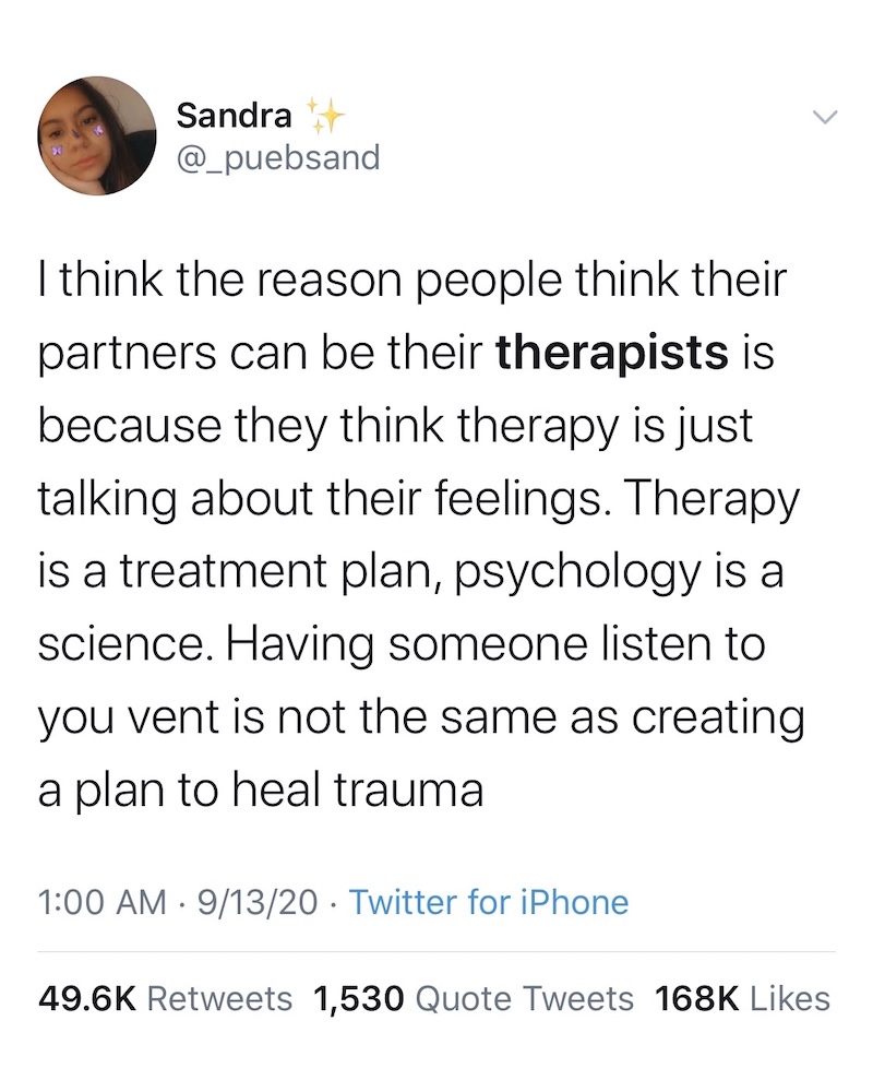 After one of our posts went viral on Instagram, we figured it was best to expound on the thread that Sandra from Twitter, below, so thoughtfully started. Why is it, exactly, that your partner shouldn’t be your therapist?